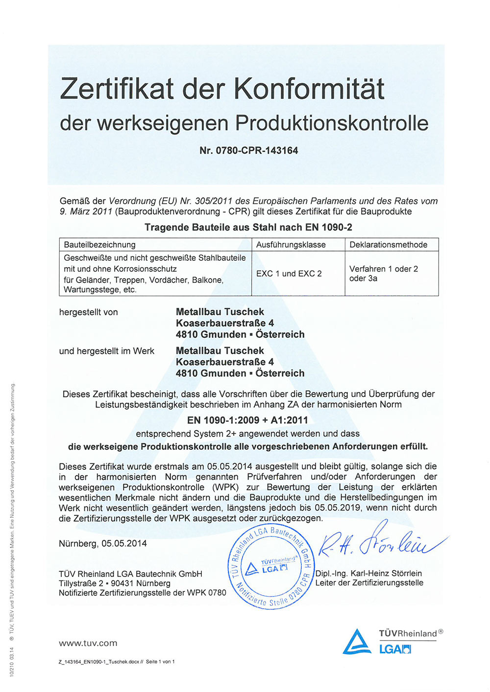 Zertifikat nach EN 1090-1-1:2009+A1:2011 Tragwerke und Bauteile aus Stahl und Edelstahl nach EN 1090-2 – Ausführungsklasse EXC 2